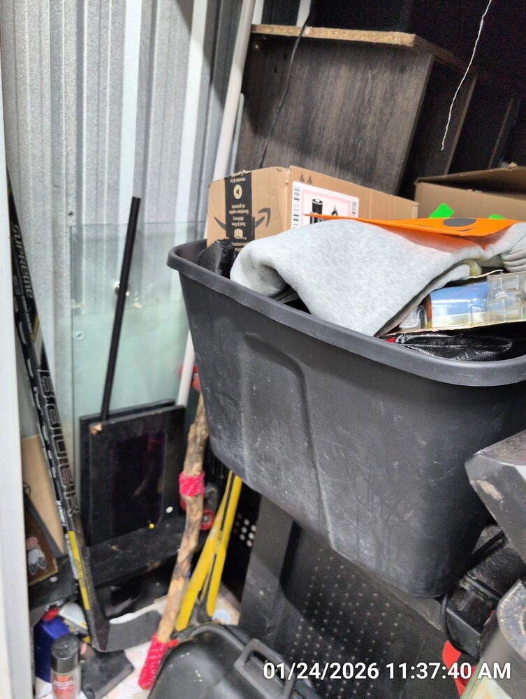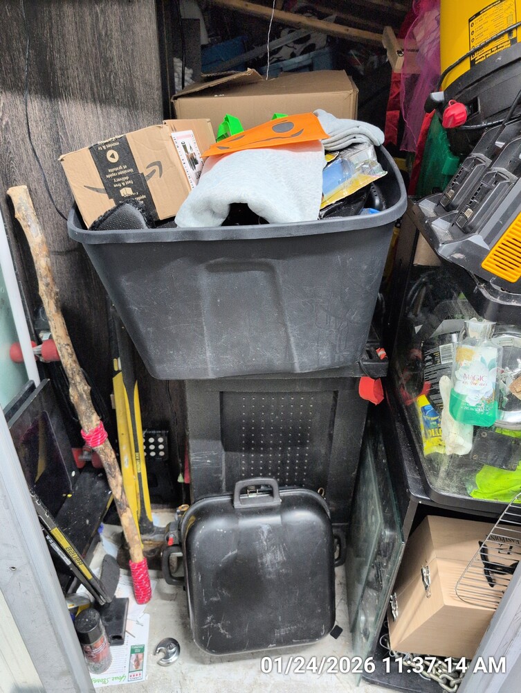shop vac, batter charger, bbq, hand tools, misc totes/boxes/bags, bike, toolbox, aquarium