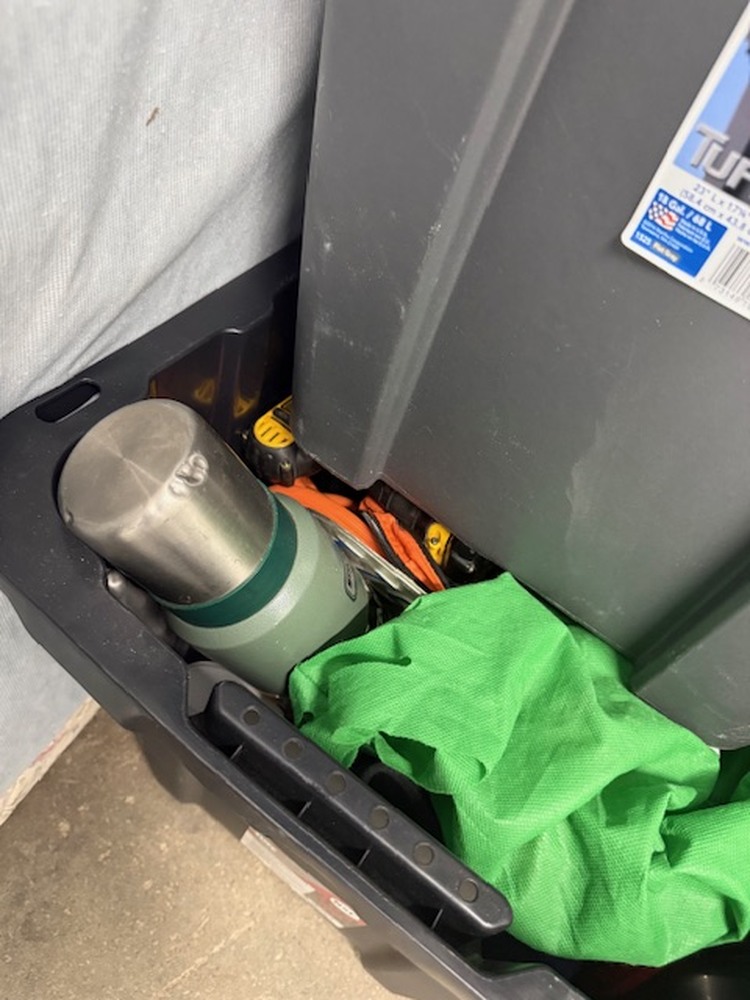 Unit contains a mattress, plastic totes, tools, bags, ect. . .