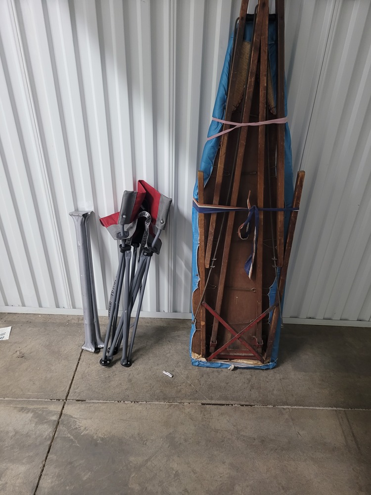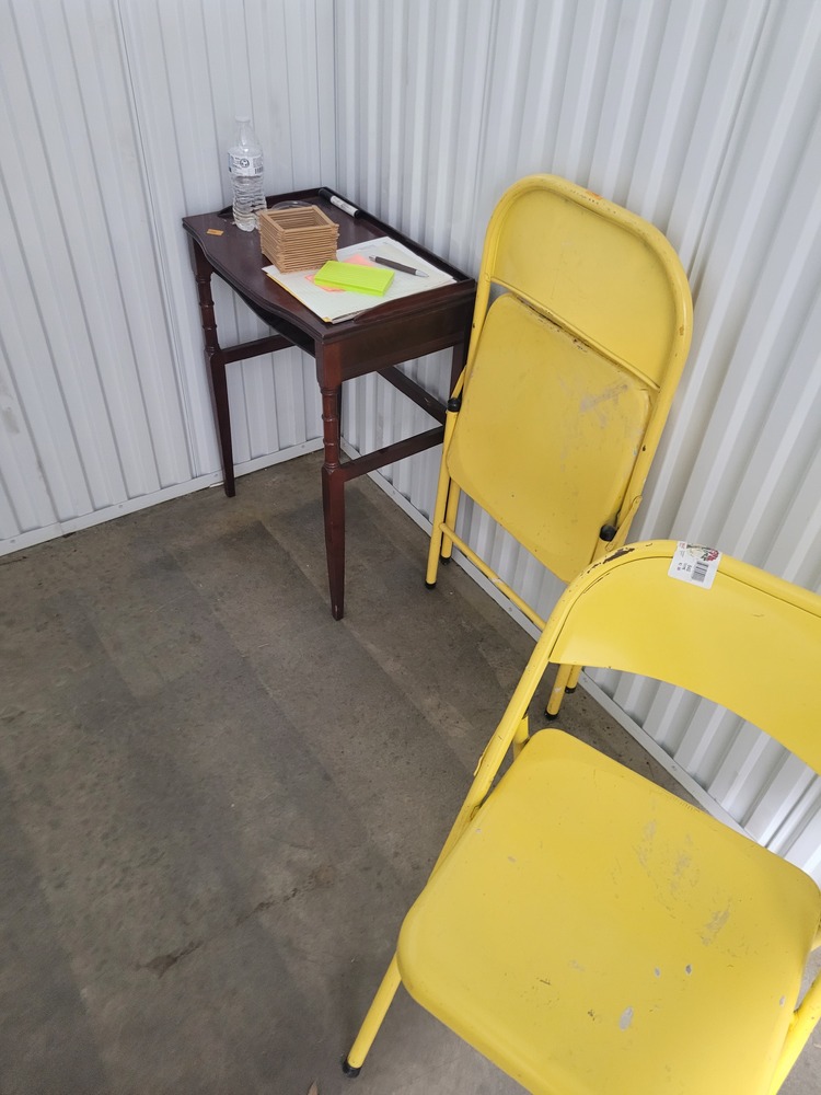 may contain: 2 yellow folding chairs, a nice little table, with a pen and table on it with a bottle of water, ironing board, wardrobe box bar, camping chair