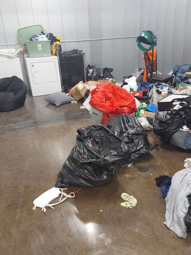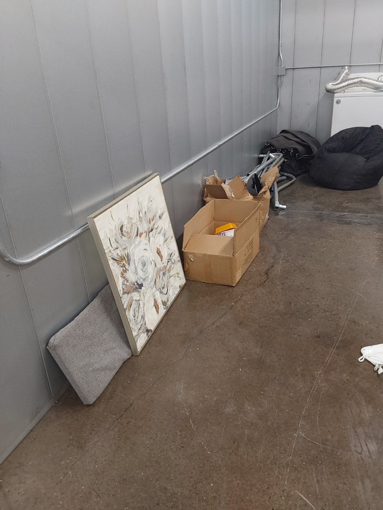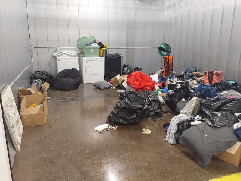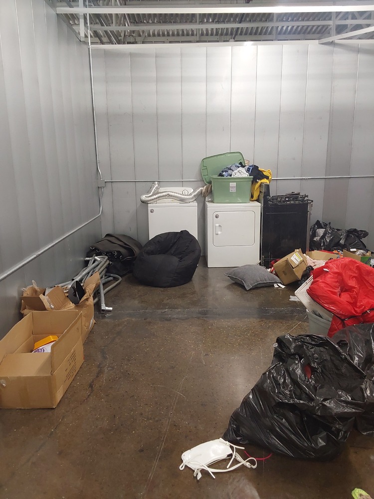 Appears to contain washer, Appears to contain dryer, Appears to contain tent, Appears to contain stove, Appears to contain head lamp, Appears to contain suitcase, Appears to contain wall art, Appears to contain purse, Appears to contain bean bag, Appears to contain bags of clothes, Appears to contain ottoman, Appears to contain baskets/bins of various items.