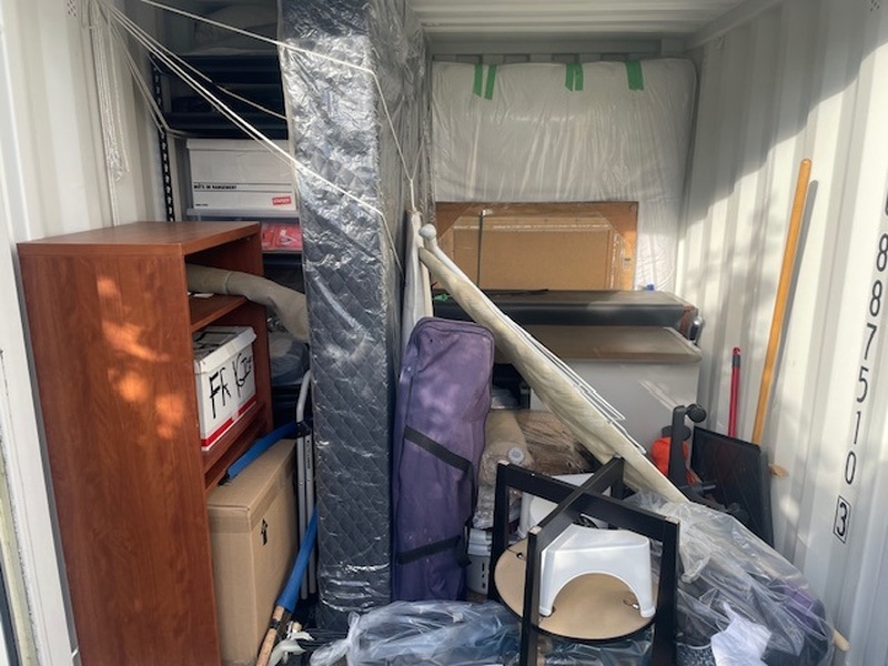 All items are up for auction inside this 8' BSB container. Which is loaded with what we believe to be a mattress and box spring, shelving units, fishing rod, furniture, and other miscellaneous items