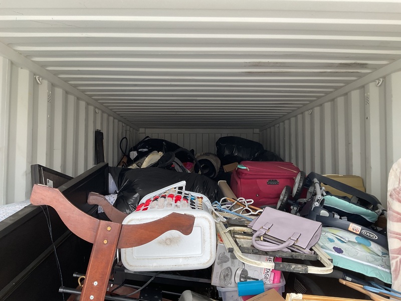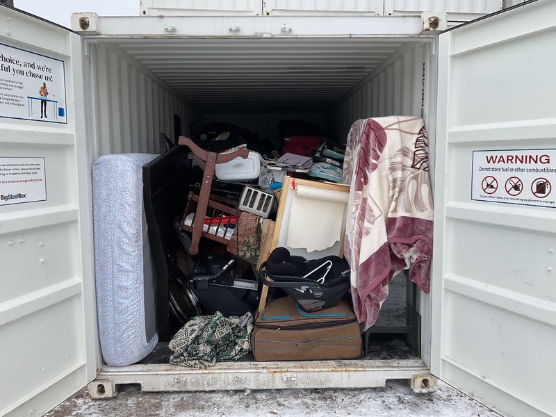 All items inside this BigSteelBox container are up for auction, which is loaded with what we believe to be furniture, mattress, stroller, luggage, and other