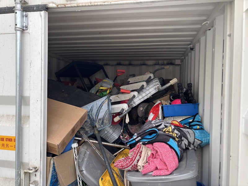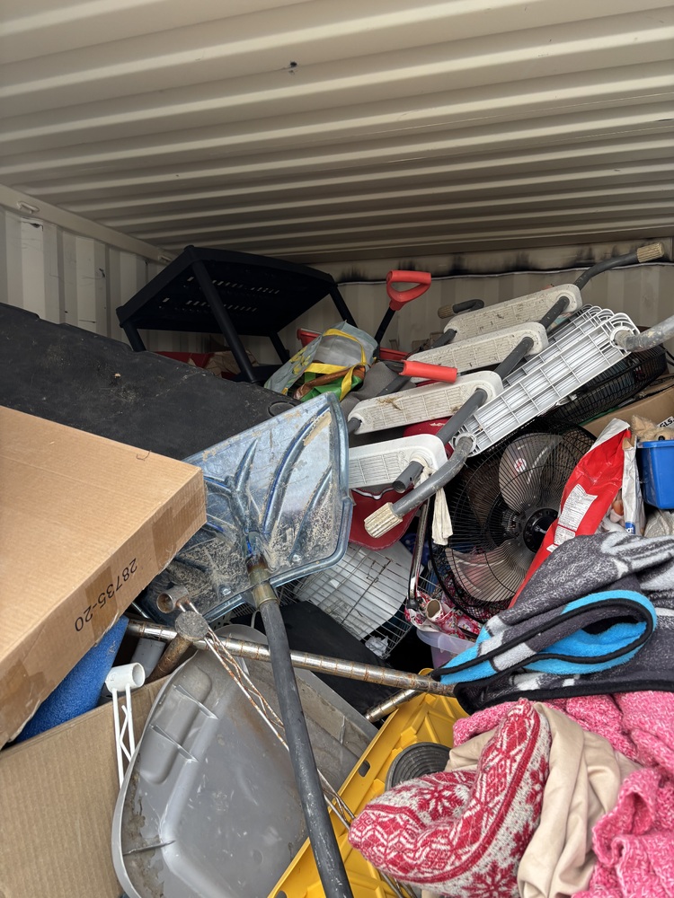 All items inside this 10' BSB are up for auction. Which is loaded with what we believe to be shovels, fans, totes, a shelving unit, and other miscellaneous items
