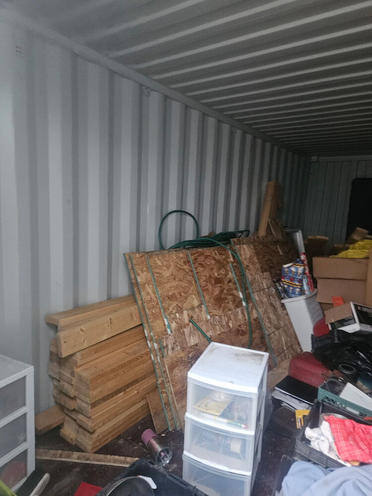 All items inside this 20' BSB container are up for auction. Which is loaded with what we believe to be construction supplies, a tote labeled tools, a shelving unit, and other miscellaneous items