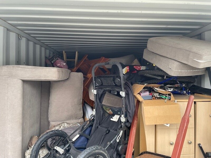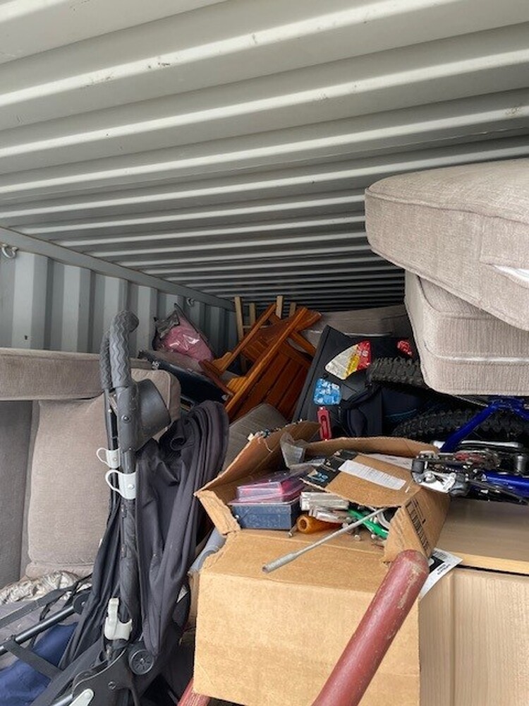 All items inside this BigSteelBox container are up for auction, which is loaded with what we believe to be furniture, wheelbarrow, couch, stroller, bike, and other miscellaneous items.