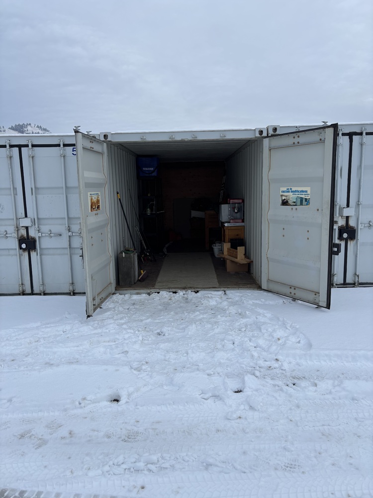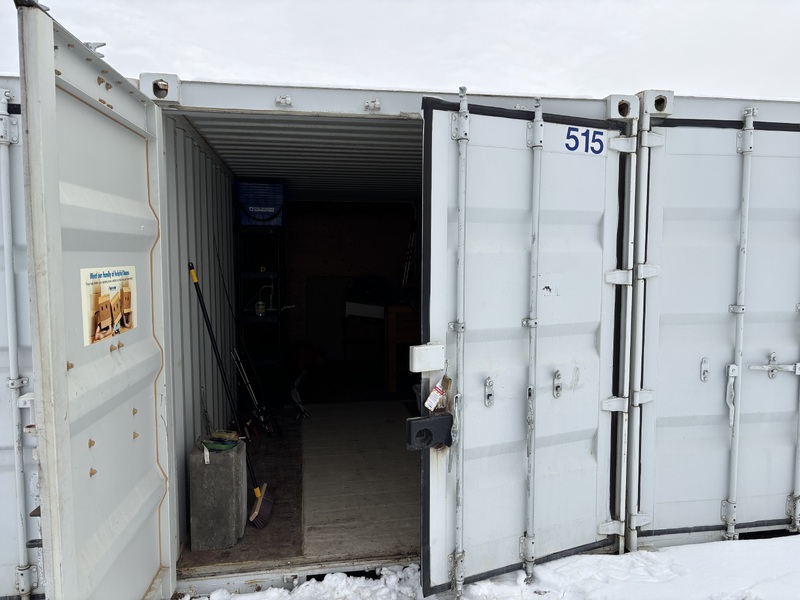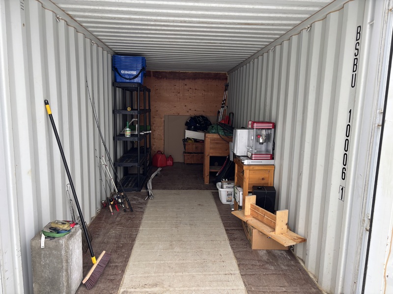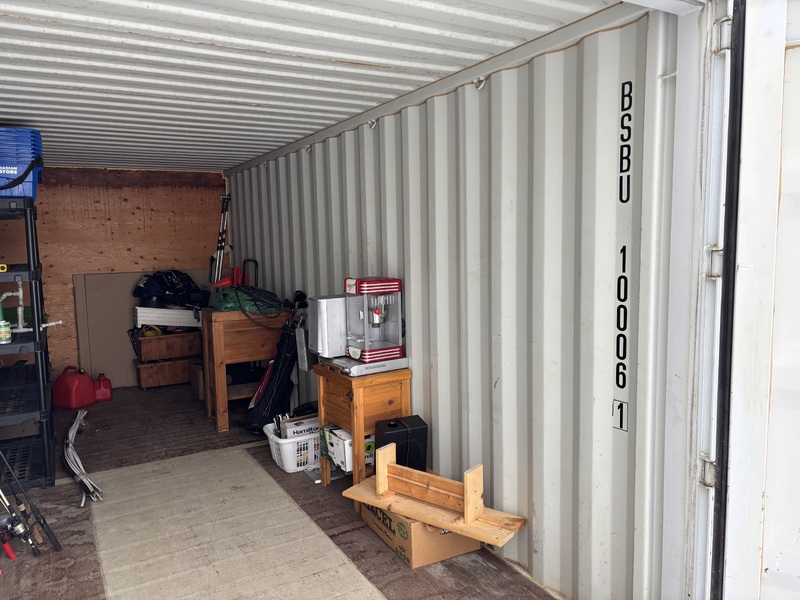 All items inside this 40' Mini storage container are up for auction. Which is loaded with what we believe to be a stereo, kitchen equipment, popcorn maker, golfing equipment, hockey equipment, fishing rods, shelving, and other miscellaneous items