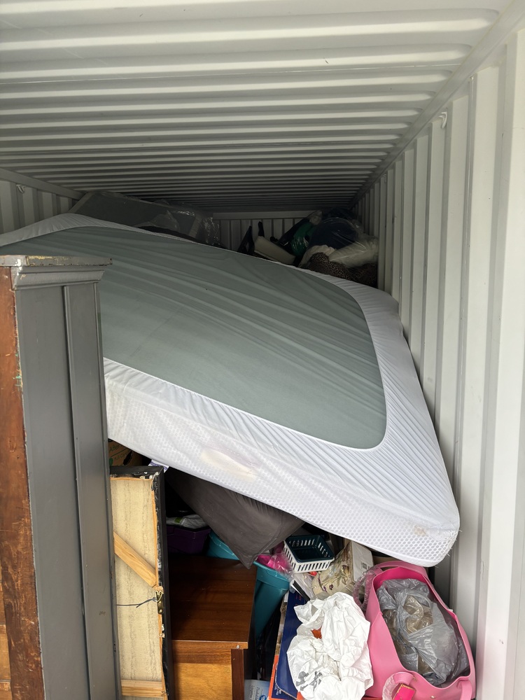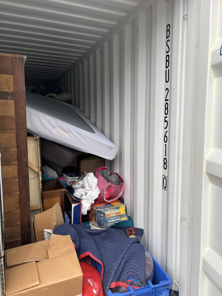 All items inside this 20' BSB container are up for auction. Which is loaded with what we believe to be a shelving unit, a mattress, furniture, household items, and other miscellaneous items