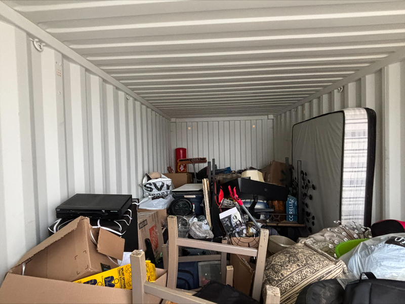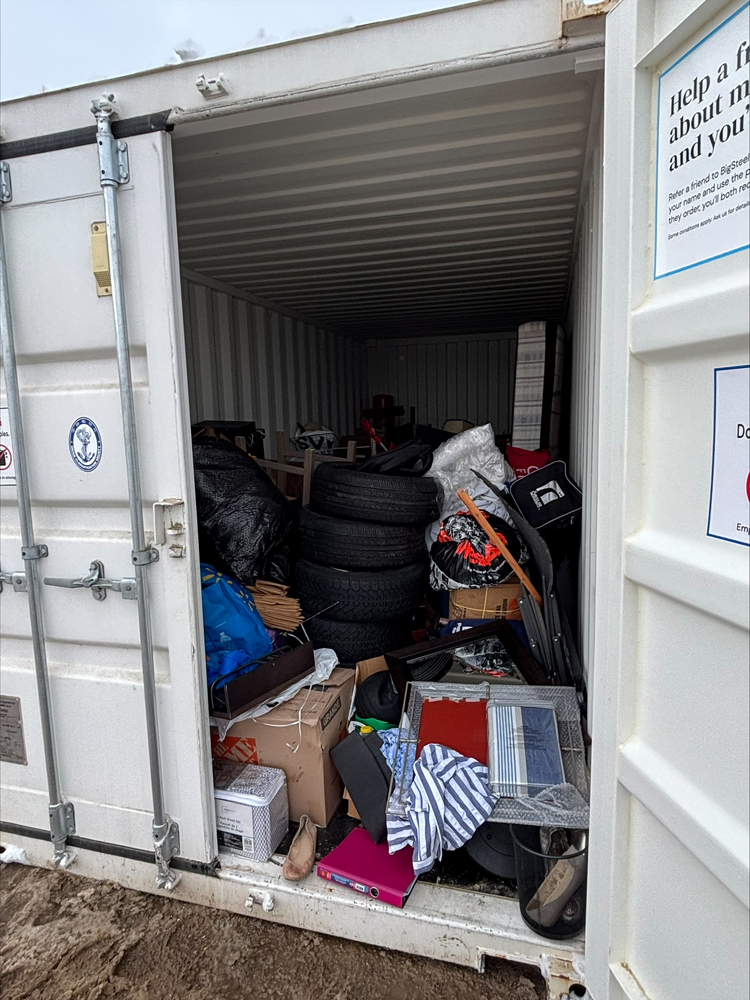 All items inside this BigSteelBox container are up for auction, which is loaded with what we believe to be furniture, tires, a mattress, boxes, and other