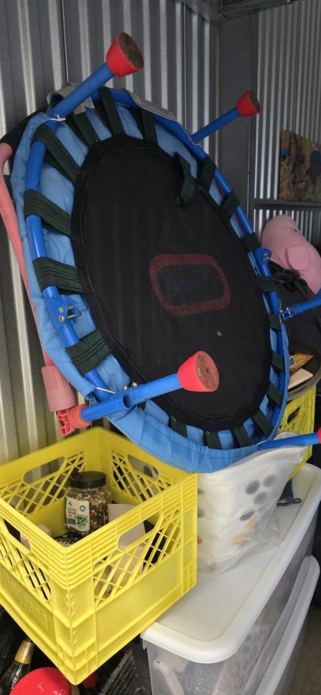 kids chairs, personal items, misc. bags & boxes, Bike, totes, workout trampoline, artwork, rug, street signs