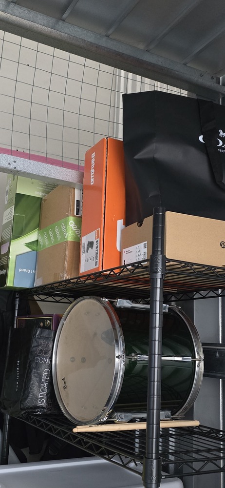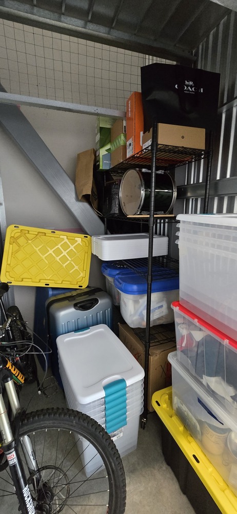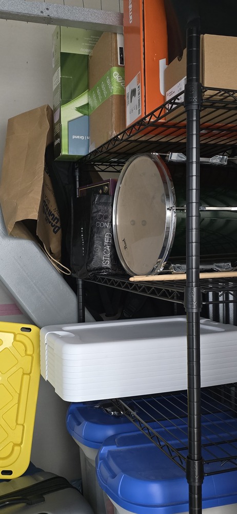 personal items, misc. bags & boxes, Bike, totes, shelf, drum, bike tires, guitar case and possibly guitar