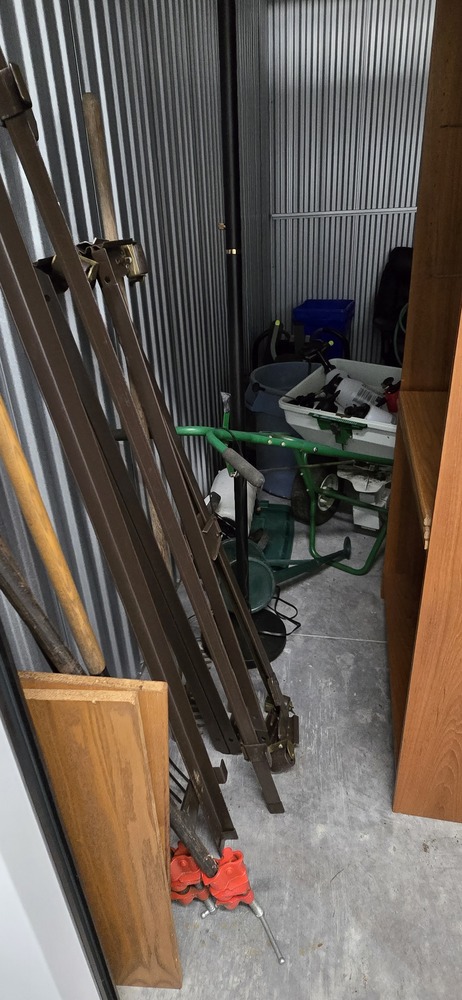 bed frame, chairs, personal items, misc. tools, misc. bags & boxes, wood shelving, bed frame, totes, garden hose, grass trimmer, landscaping tools, gym bike, lamp
