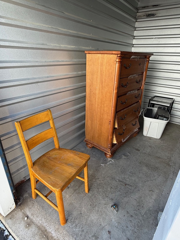 Unit contains 1 wooden chair, 1 chest of drawers, 2 nesting side tables, 1 plastic tote with desktop computer tower, ect. . .