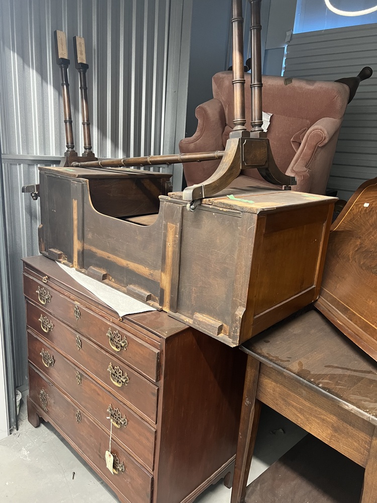 Furniture, Wooden Chair Parts, Antique Spinning Wheel, Chest of Drawers