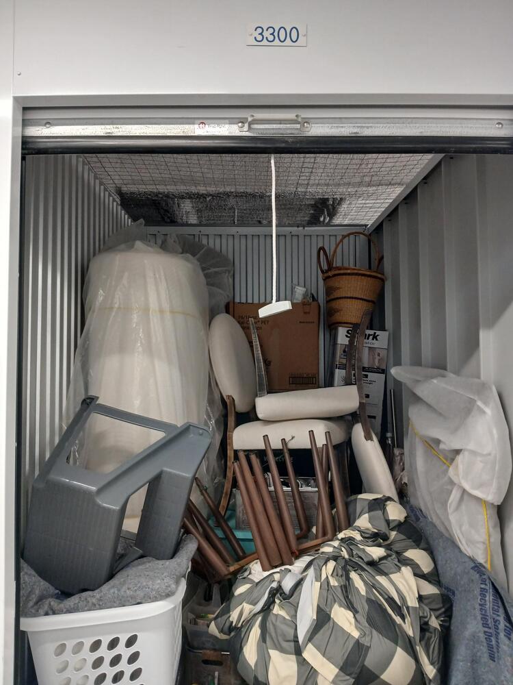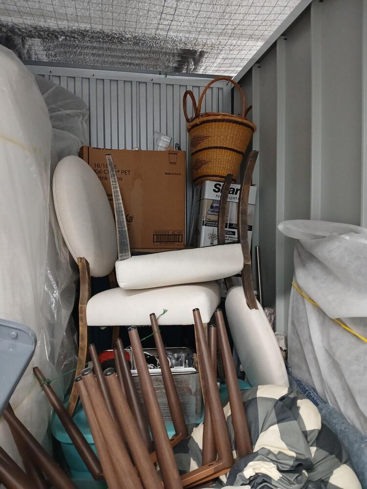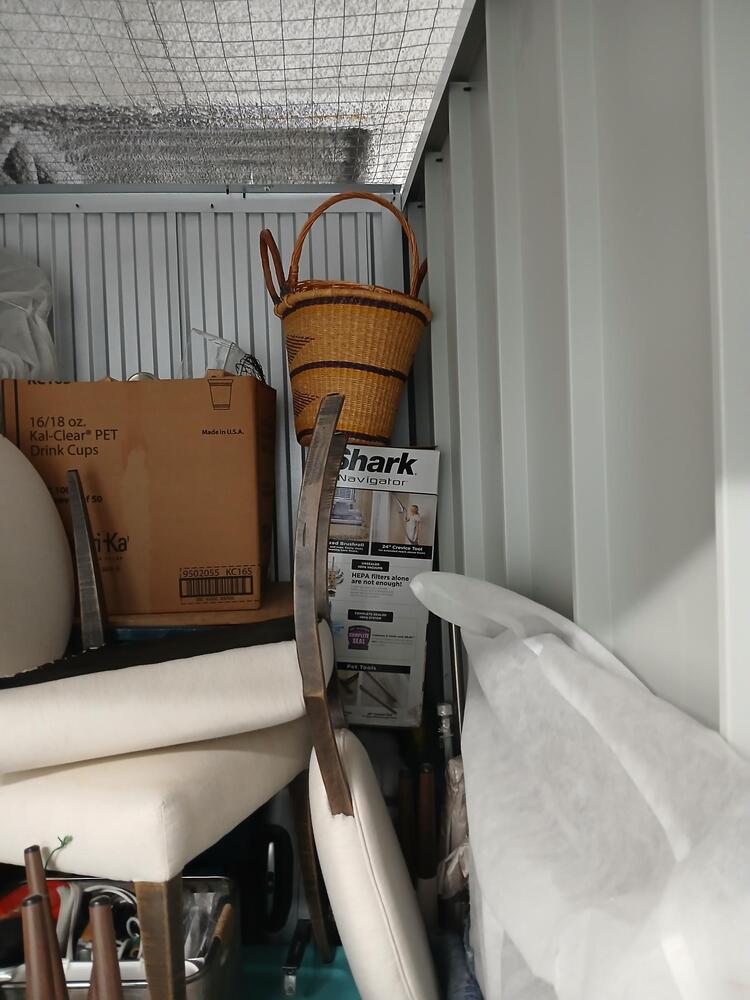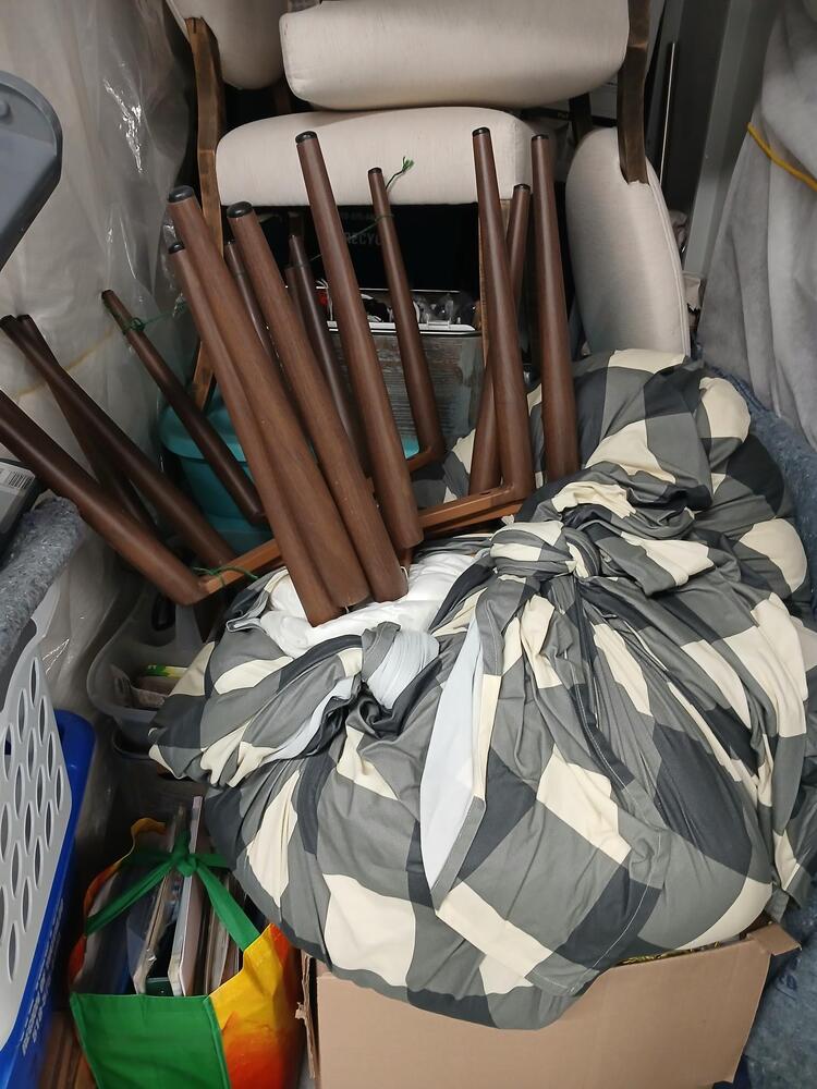 chairs, furniture, suitcase, step ladder, shark navigator, boxes, bins