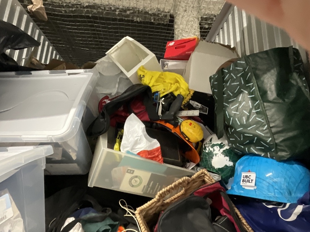 Boxes, bags, totes, sports equipment, tools, clothing, utility lamp