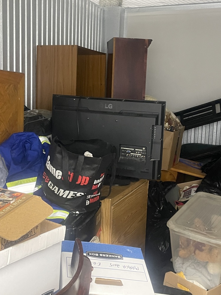 TV, wooden furniture, boxes, suitcase, table, garbage bags, drawers, etc.