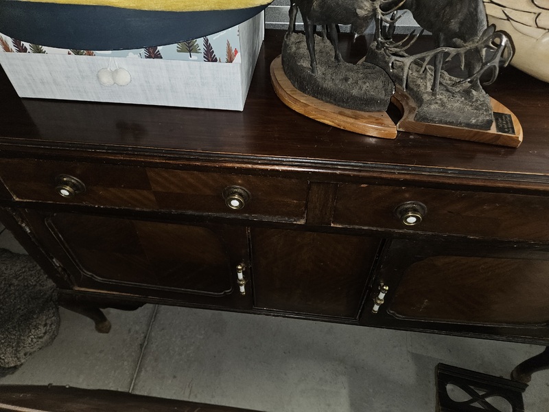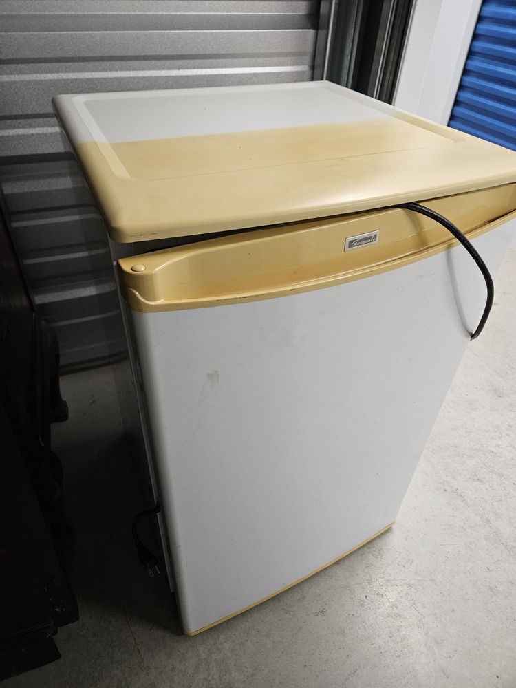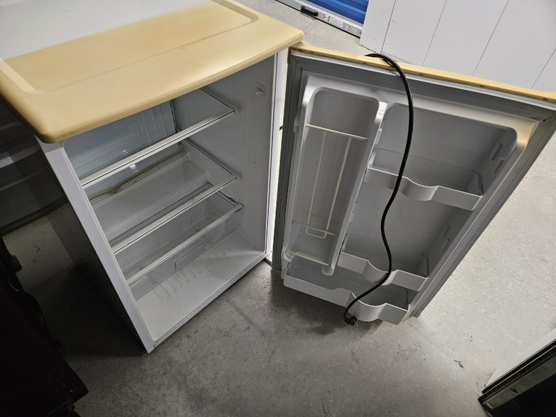 Manager special/build unit. Fridge was cleaned and checked and it works. Furniture piece needs some TLC. As is, where is.