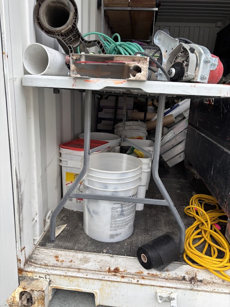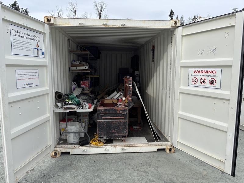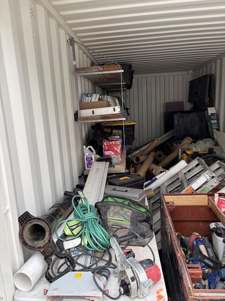 All items inside this 20' BSB container are up for auction. Which is loaded with what we believe to be construction supplies, tools, tool boxes/bags, shelving, totes, ladders, a table, and other miscellaneous items