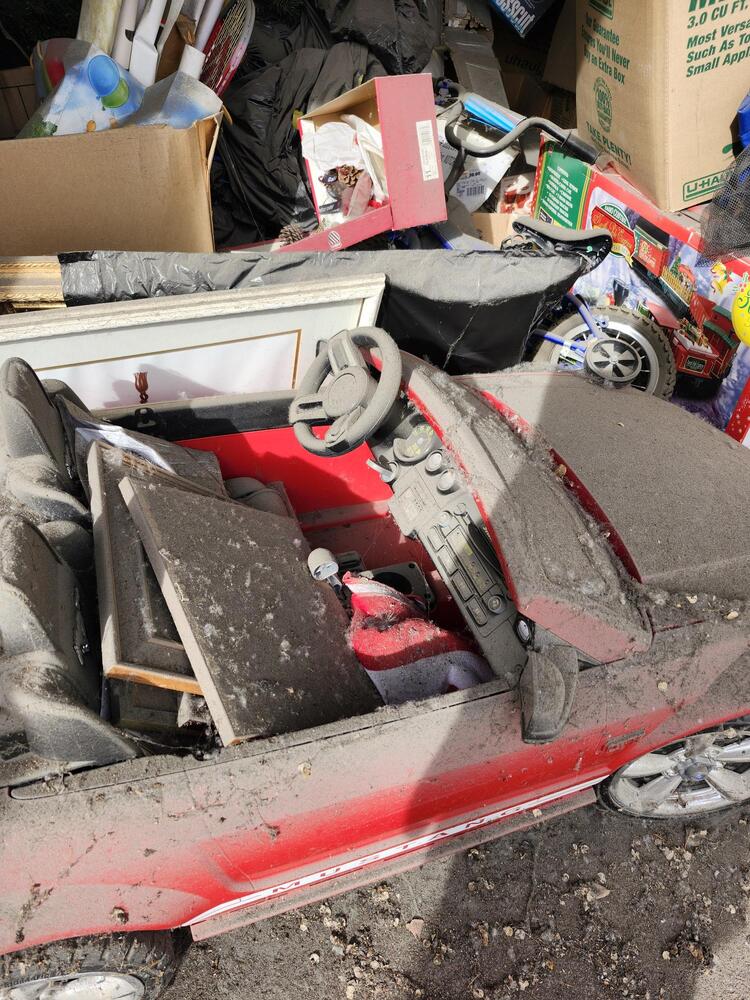 kids red car, rocking chair, boxes, totes, kids bike, train set, misc. items
