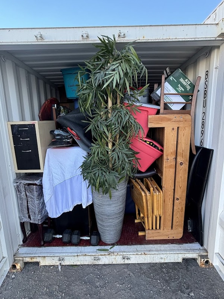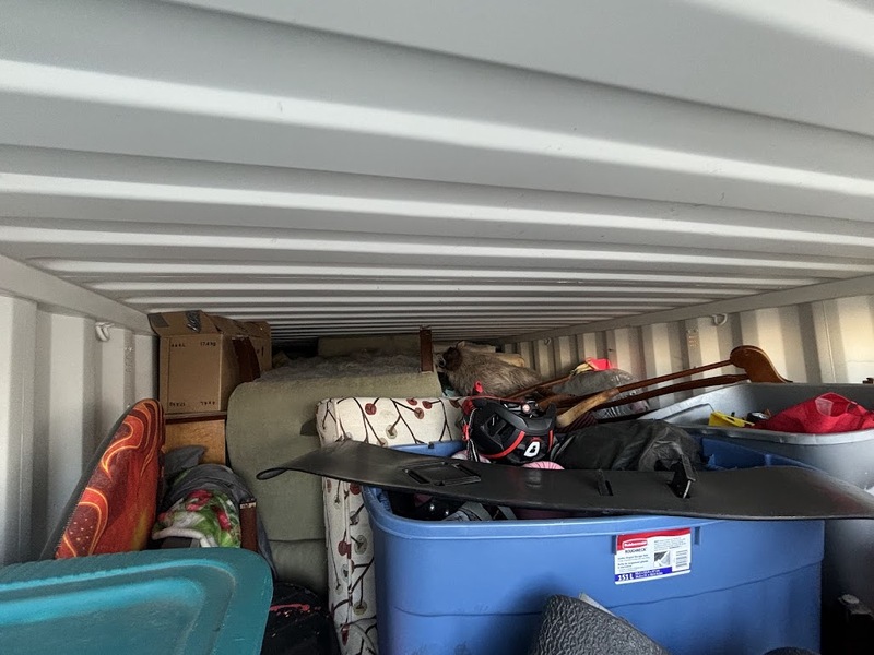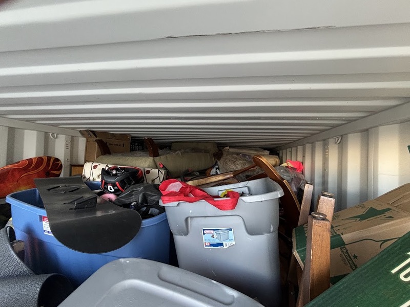 All items inside this BigSteelBox container are up for auction, which is loaded with what we believe to be furniture, snowboard, totes, boxes, and other