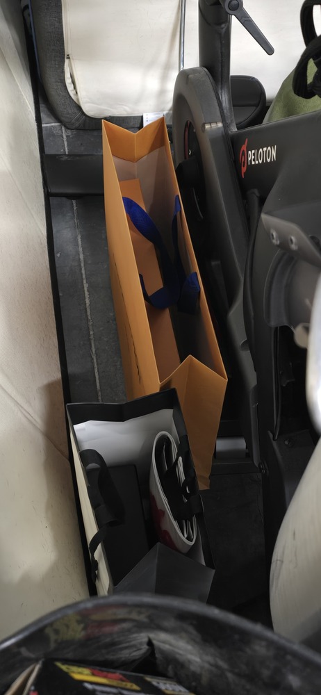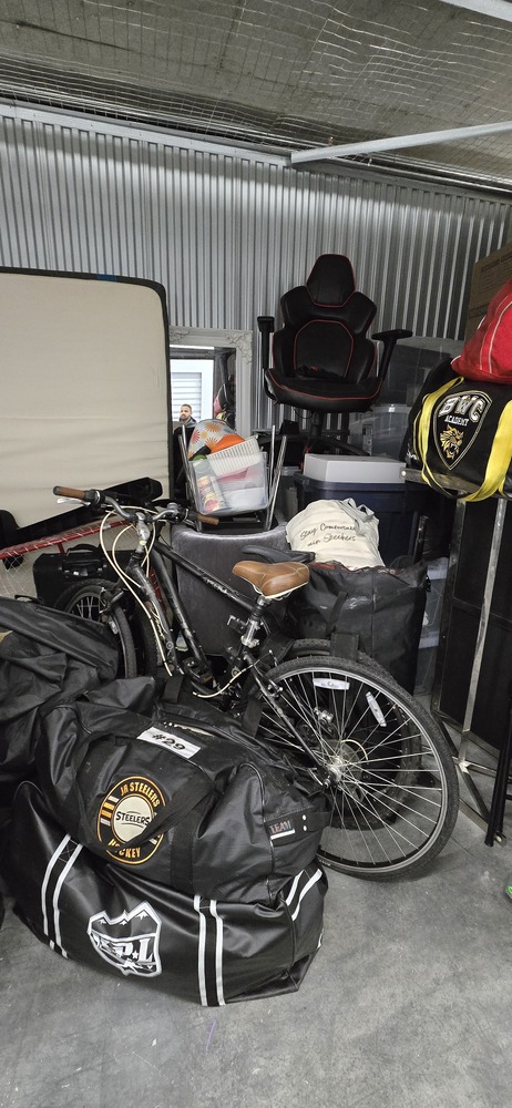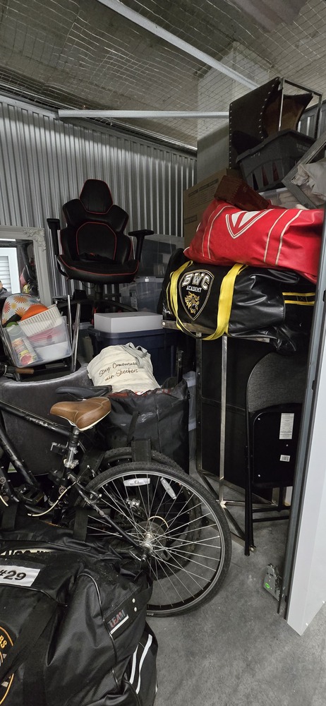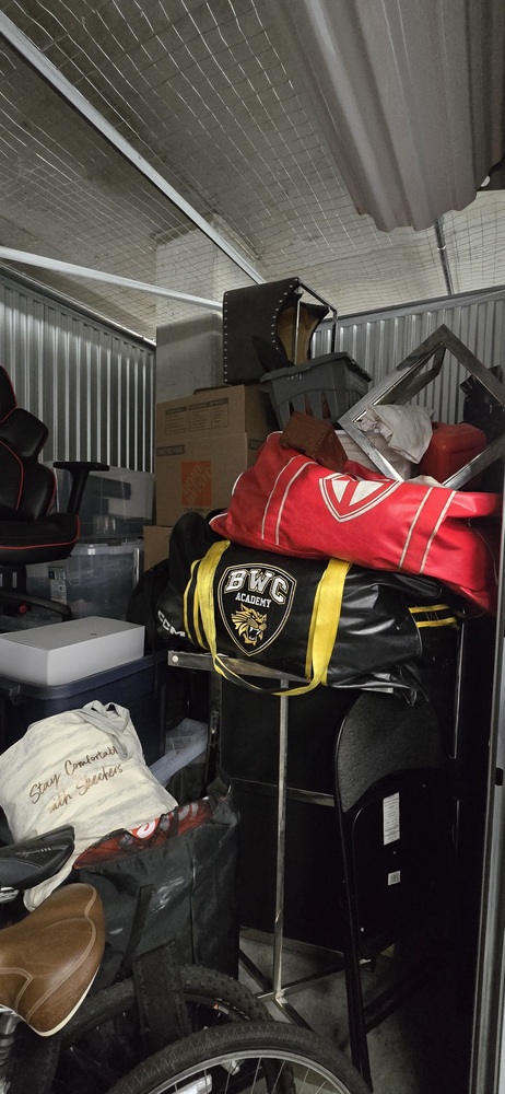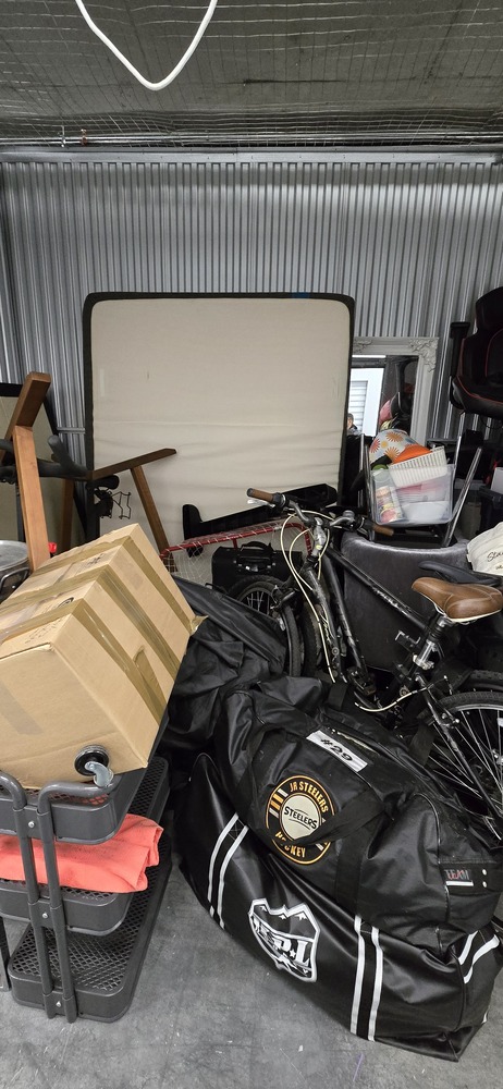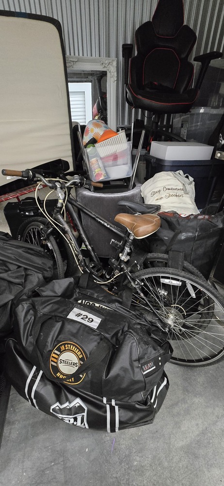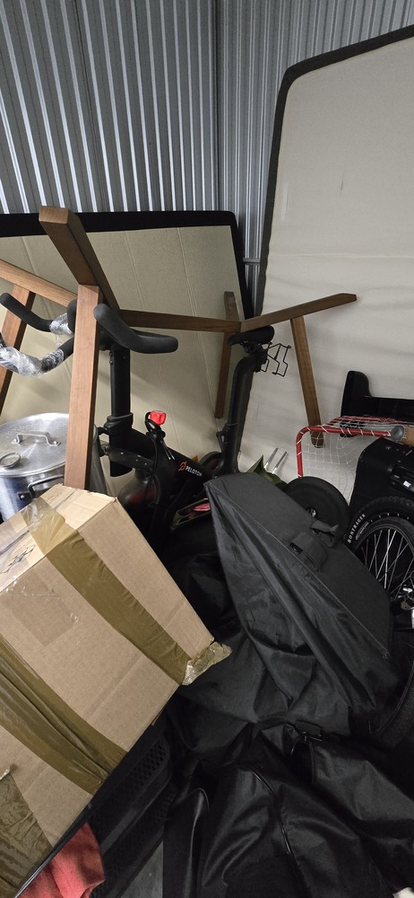 mattress, box spring, bed frame, table, TV stand, misc. bags & boxes, Peloton bike, gaming chair, golf clubs, fryer, 2 mountain bikes, totes, exercise equipment, ottoman, Kitchenware, suitcases, hockey bags