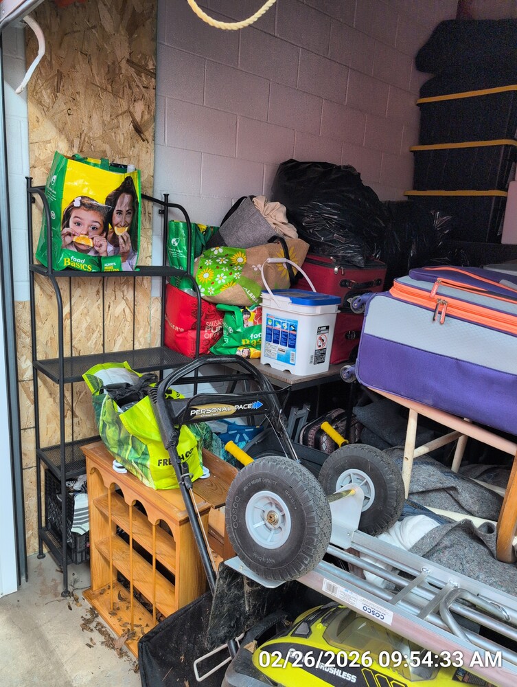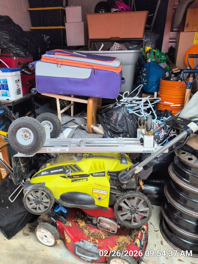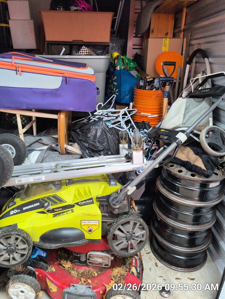 dolly, lawnmowers, rims, bakers rack, misc totes/bags/boxes, desk, misc furniture, wall shelves