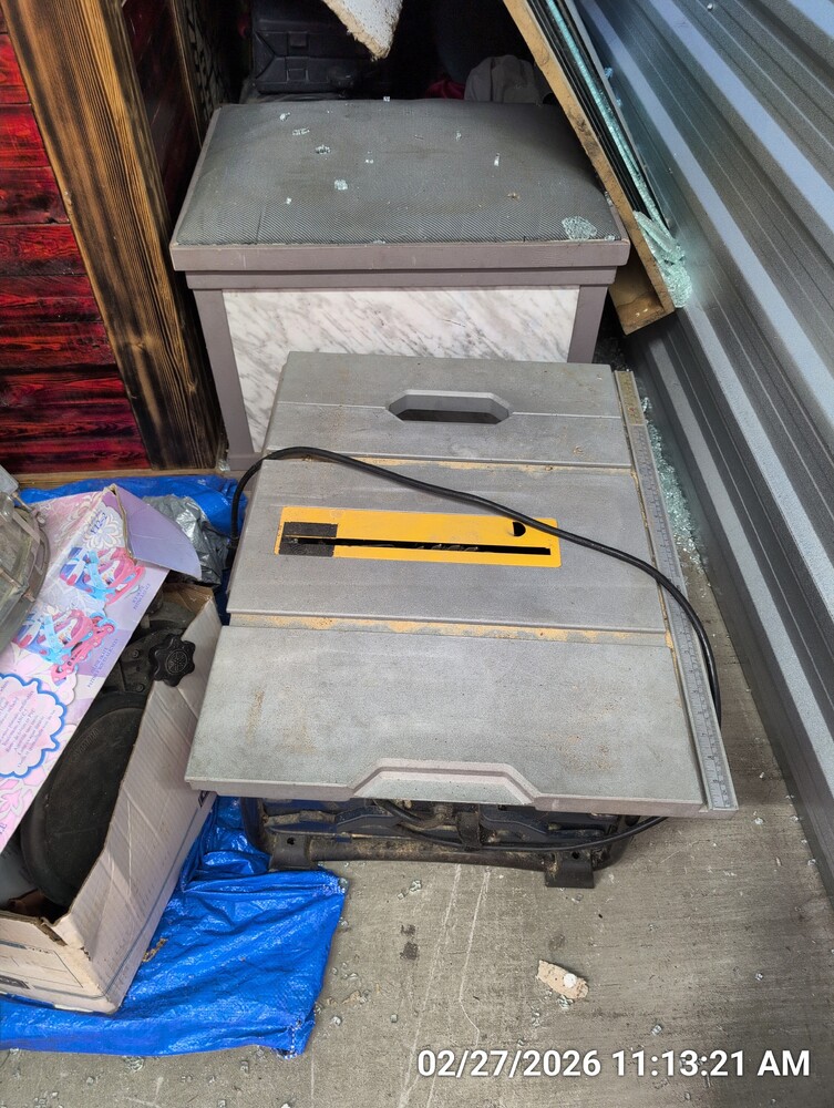 toolcases, drum, table saw, weights, shop vac, misc furniture