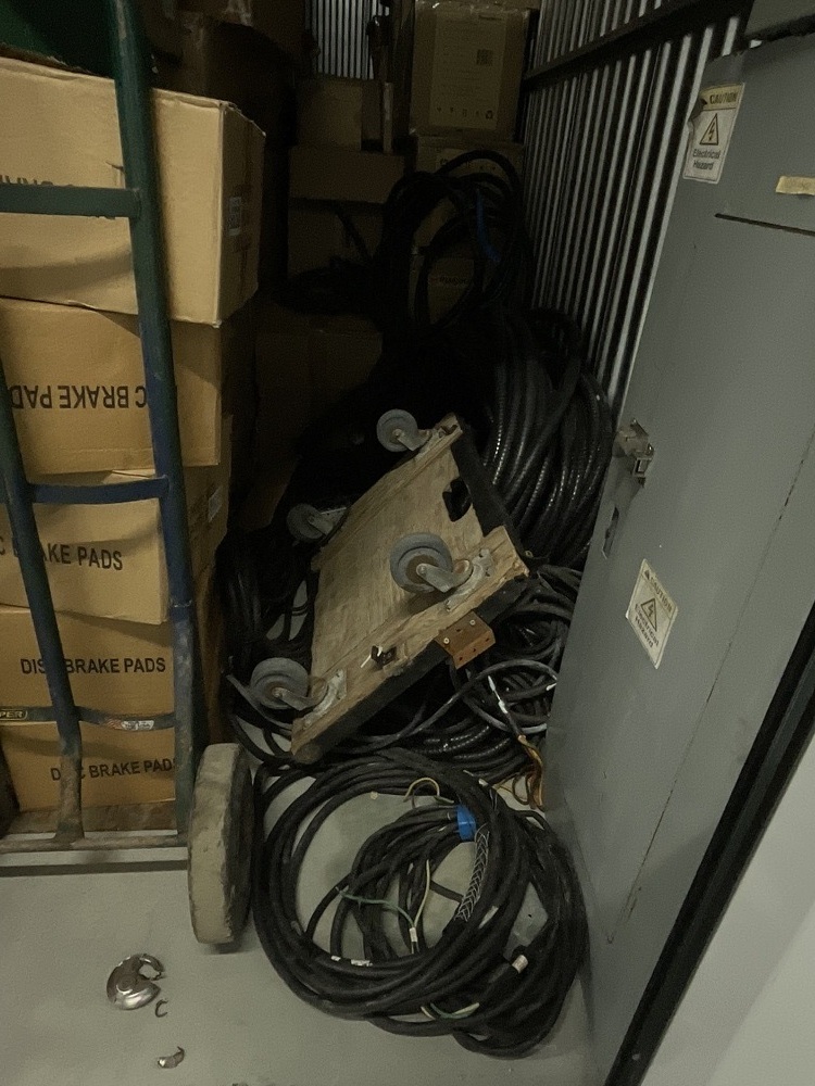 Boxes, bags, camping equipment, wires, cables, electrical equipment, tools, trolley