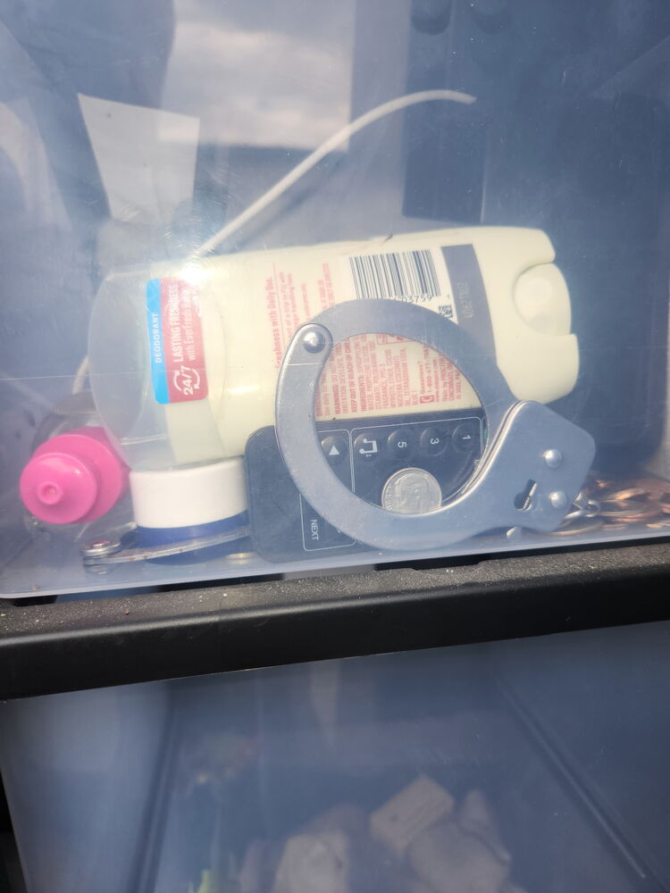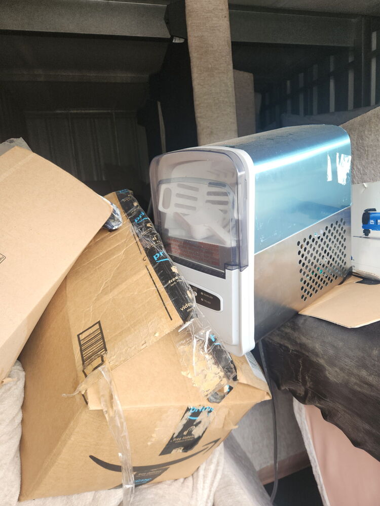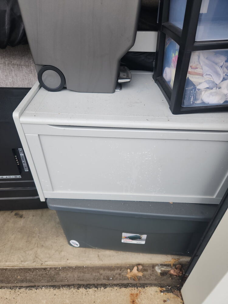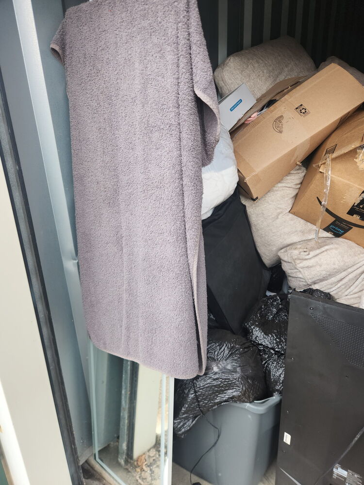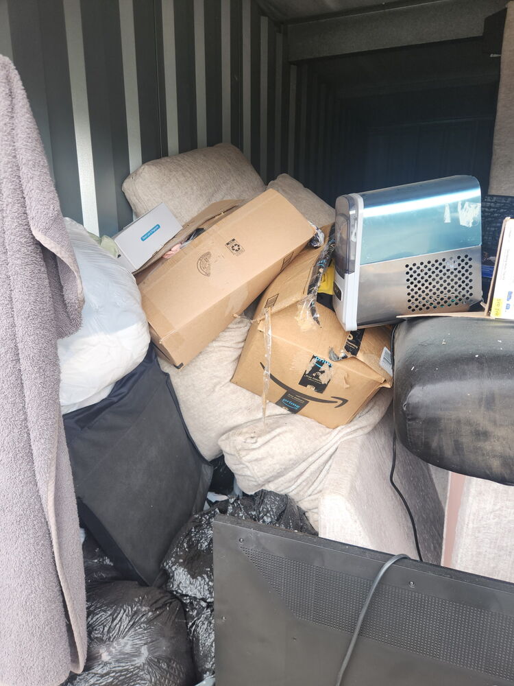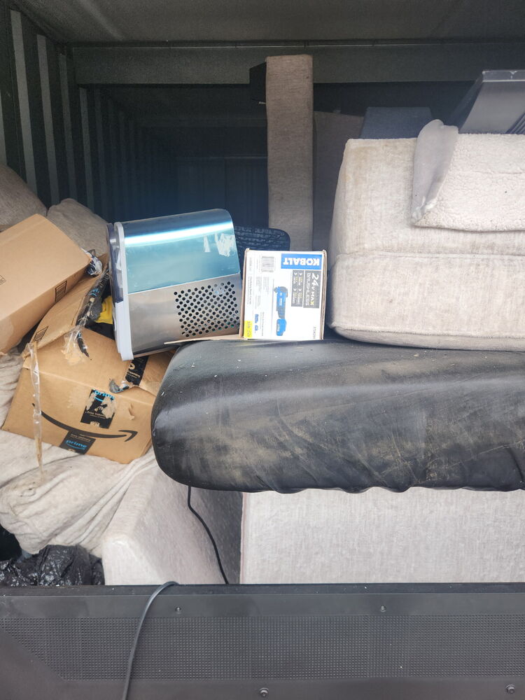 may contain: boxes, bed, couch, tv, ice maker, garbage can, bins/totes, clothing, deodorant, handcuffs, pocket change, socks, soap