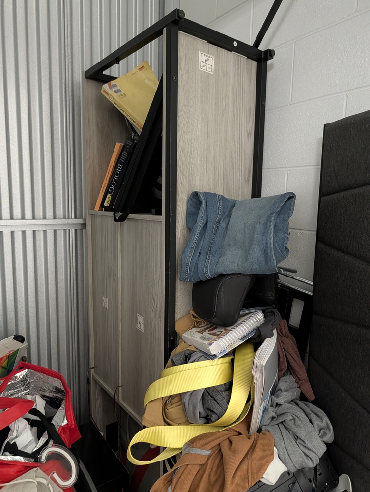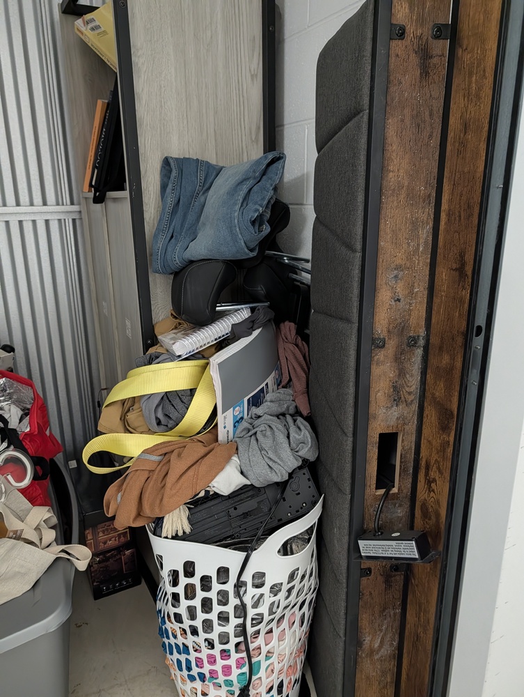Bin, bags, laundry basket, clothes, electronics, shelf, books, bike seat