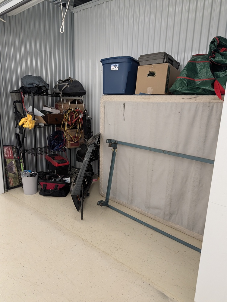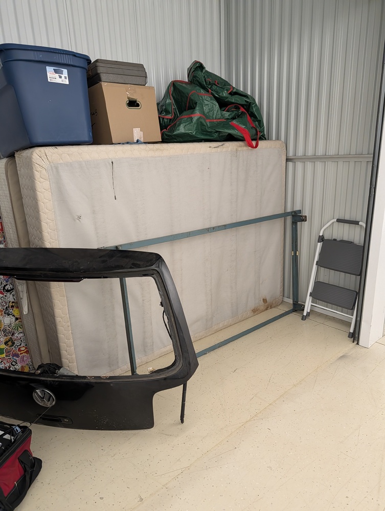 Boxspring/bedframe, shelving, bungy cords, tools, step ladder, vehicle part, tent.