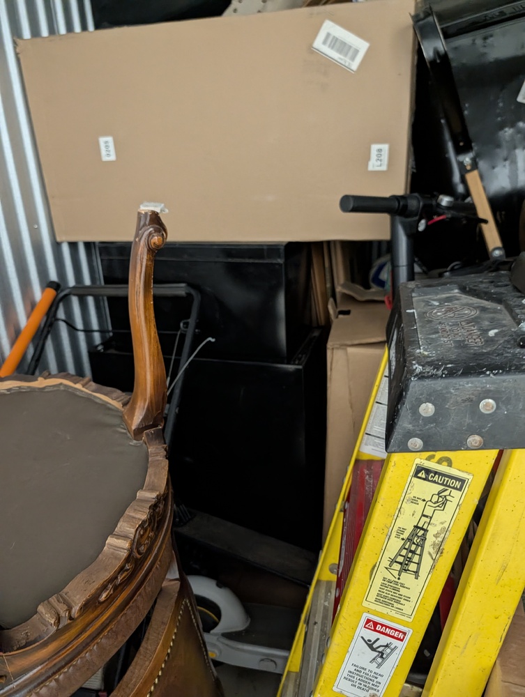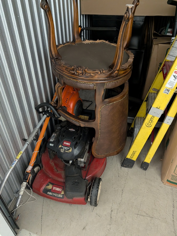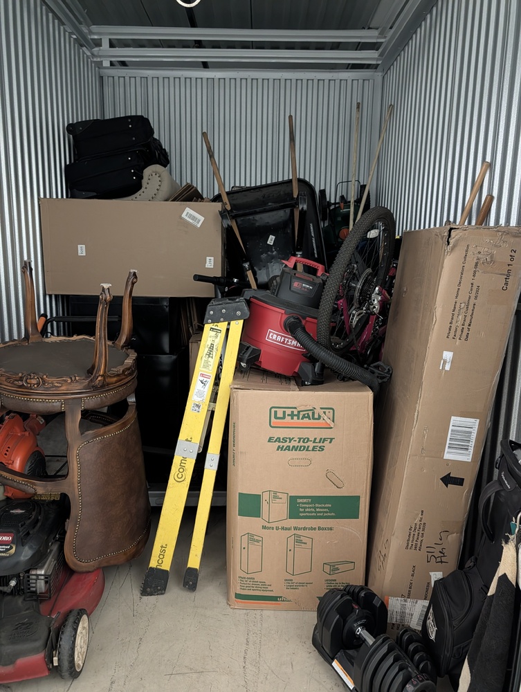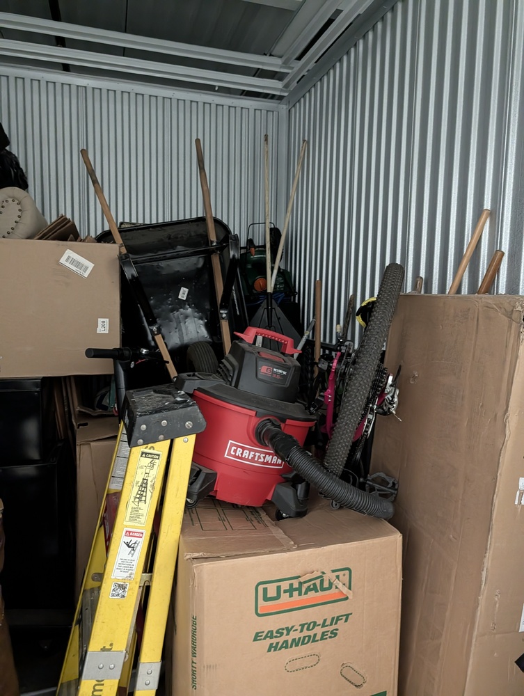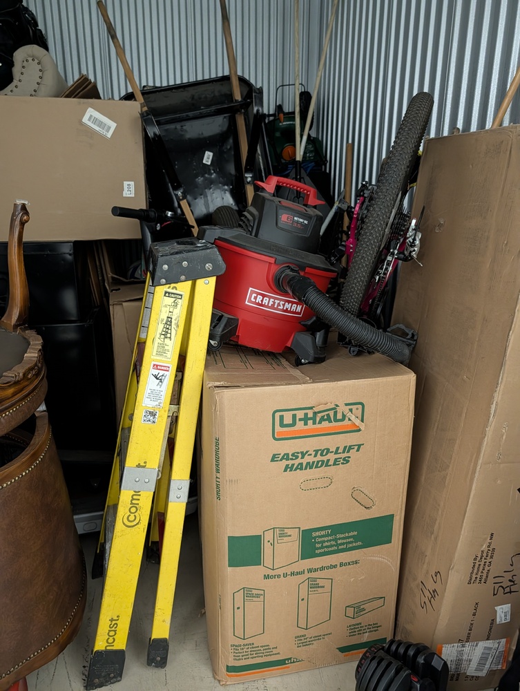Ladder, rakes, wheelbarrow, boxes, blower, bike, golf clubs, chairs, luggage, wet/dry vac.