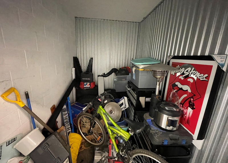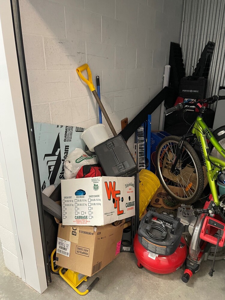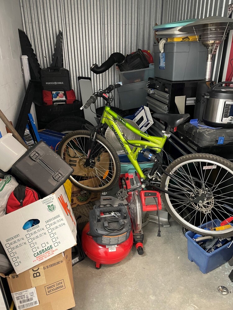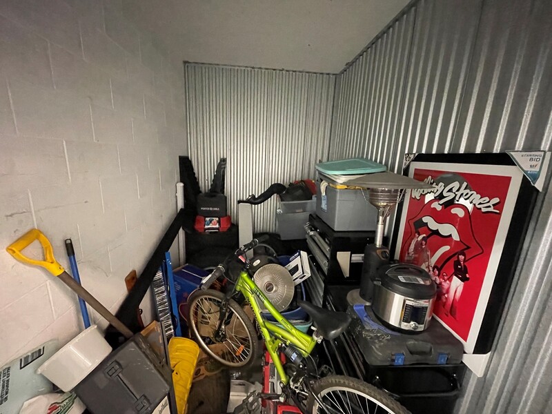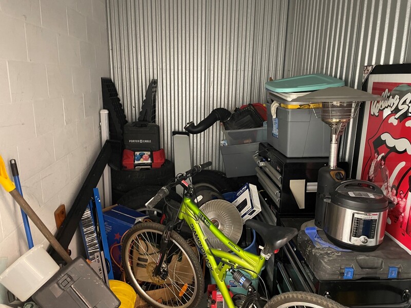 This unit has some interesting looking things in it. Bicycle, tabletop propane heater, tool chest, cool picture, instapot? maybe an air compressor?