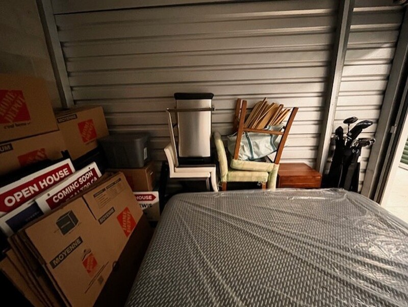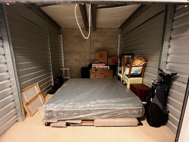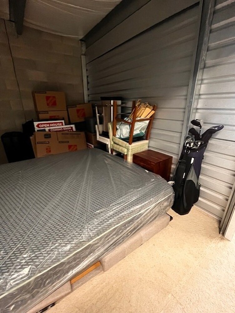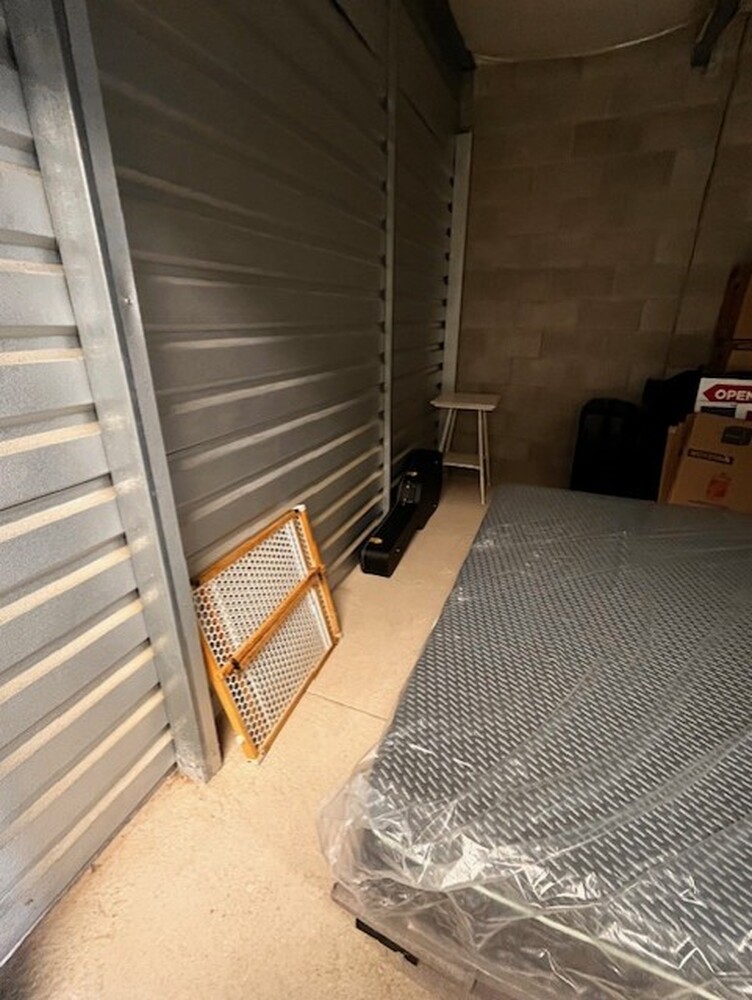 Plastic wrapped mattress, bed frame, baby gate, 4 kitchen style chairs, brown wooden side table, white wooden side table, metal side table, metal garbage bin, suitcase, guitar case, boxes, golf clubs, plastic bin, open house signs